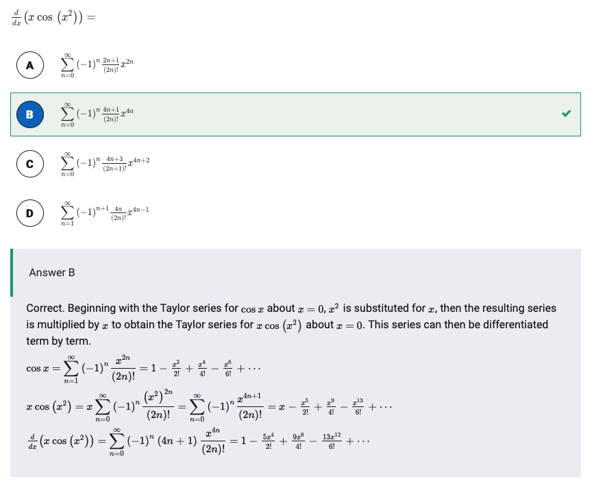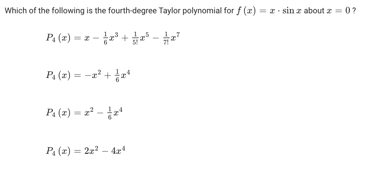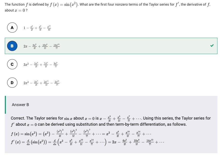 Let \(f\) be a function such that \(f'(x) = \sin (x^2)\) and \(f(0)=0\). What are the first nonzero terms of the Maclaurin series or \(f\)?
