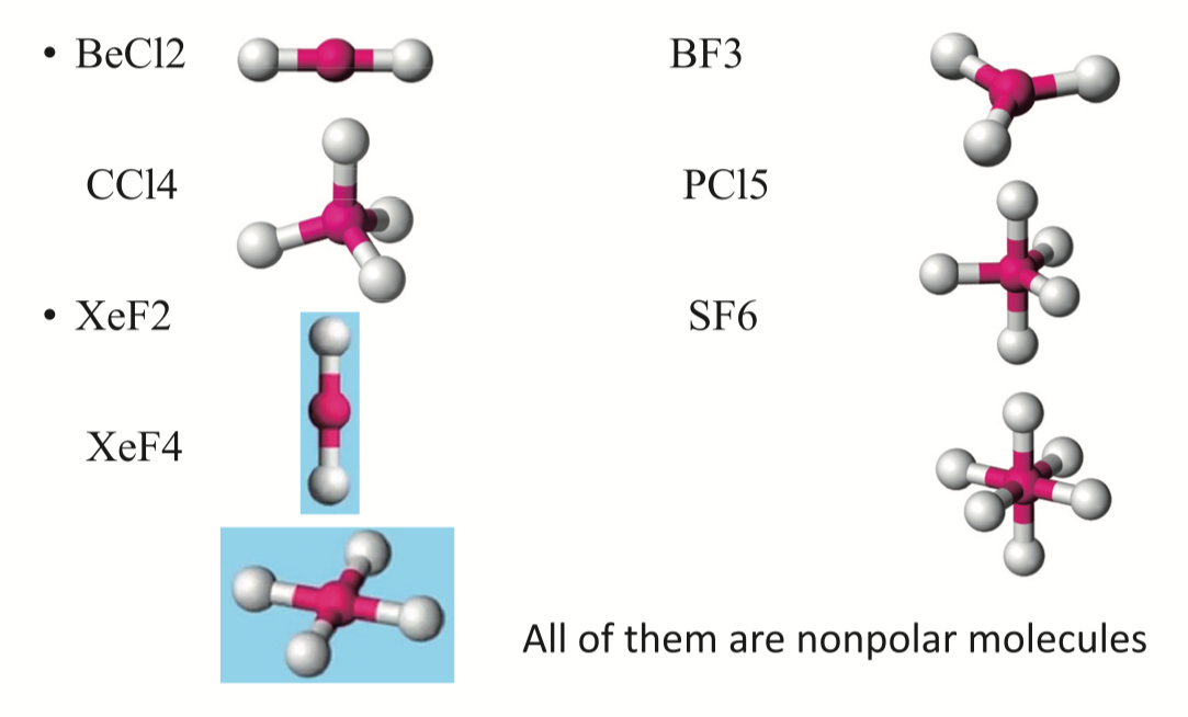 分子内都是极性键,不一定分子就是极性分子,e.g. \(\ce{CO2, CCl_4}\),分子极性主要取决于空间构型
