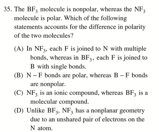 - \(\ce{BF3}\) 的构型为 \(\ce{AX3}\), 无 Lone Pair 所以是 Nonpolar,但是 \(\ce{NF3}\) 的构型为 \(AX3E1\),有 Lone Pair 且不是 \(\ce{AX_2E_3} ,\; \ce{AX_4E_2}\),可以在平面上抵消,所以是 Polar