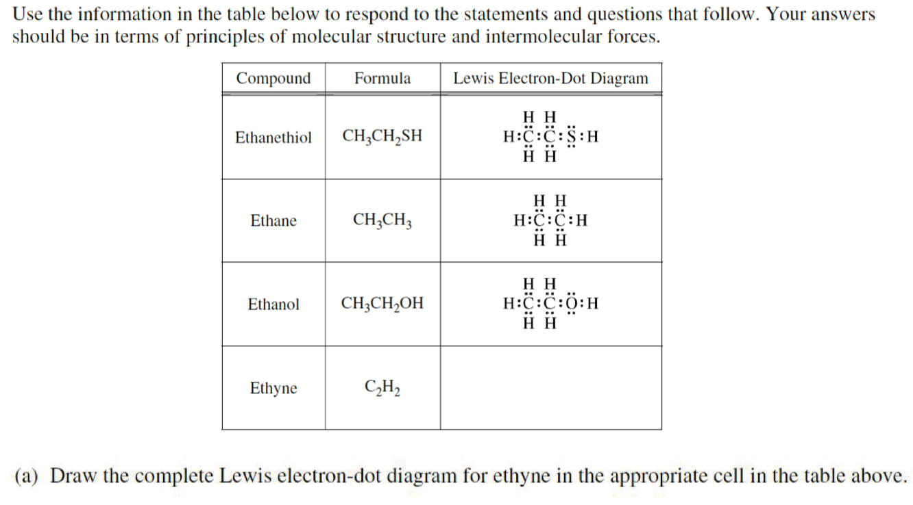 - Draw the complete Lewis electron-dot diagram for ethyne in the appropriate cell in the table above.