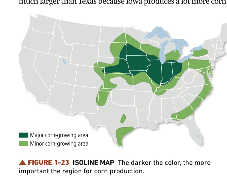 - 可识别的区域按照变量的测量比例进行阴影或图案化。例如,颜色较深的区域可能代表数据的最高范围。