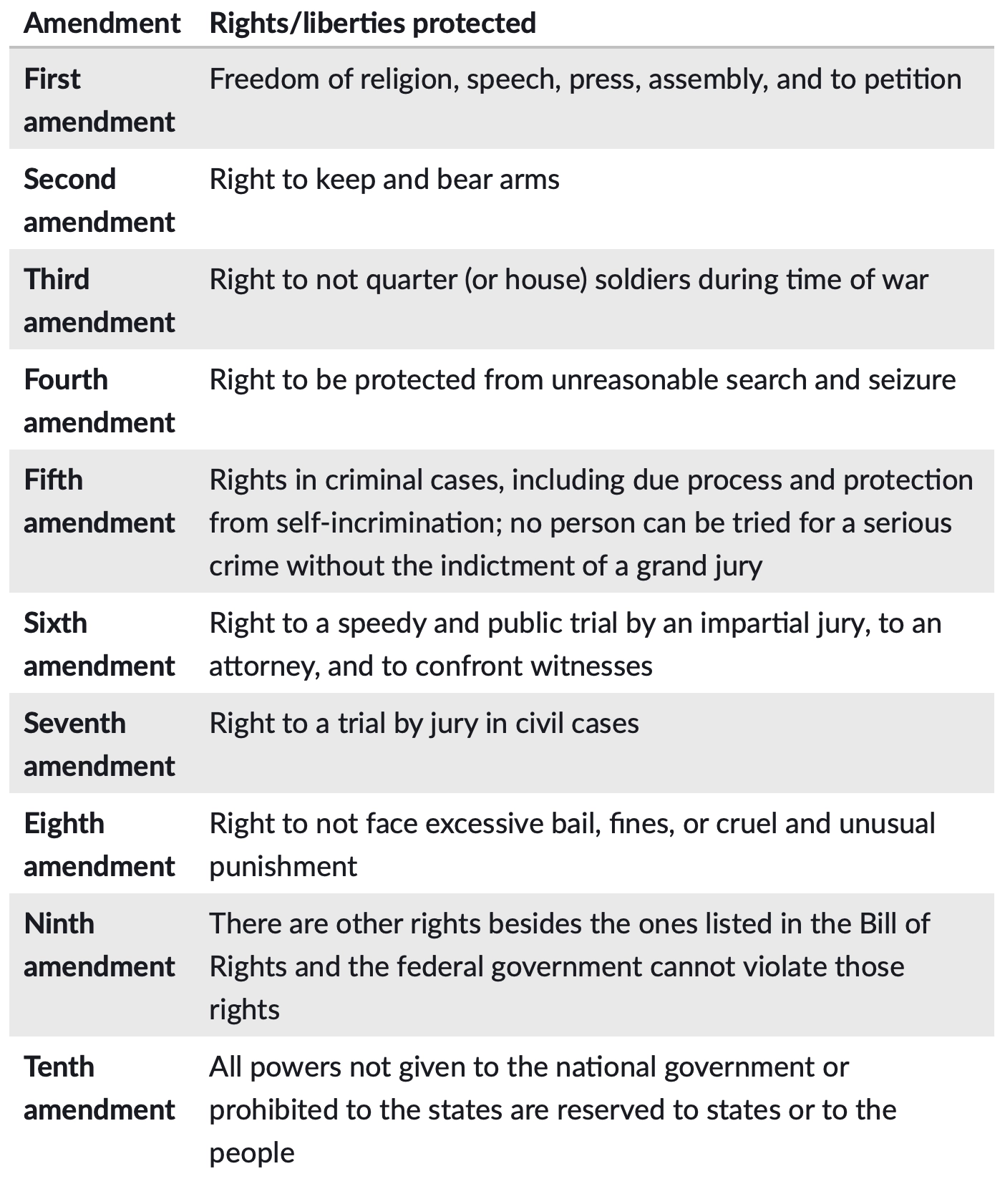 - 起初仅针对联邦政府有效,不过在第十四条修正案通过后,联邦最高法院通过一系列统称合并原则(Incorporation Doctrine)的进程将权利法案中的大部分条款应用到了各州。
