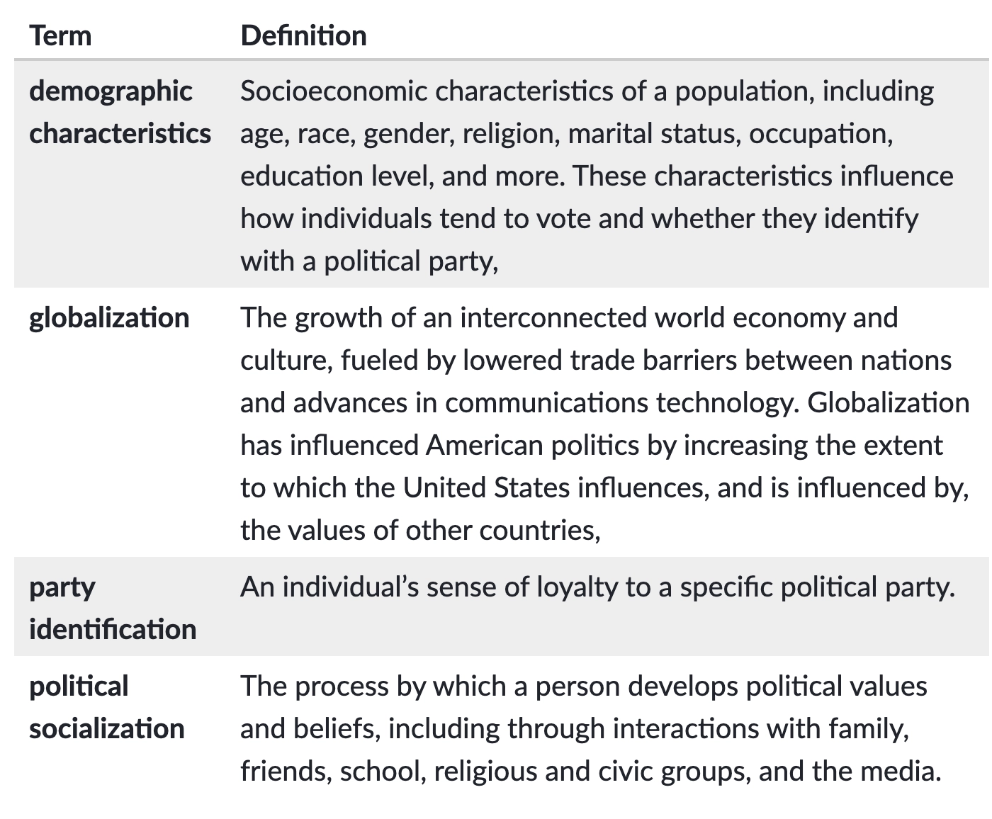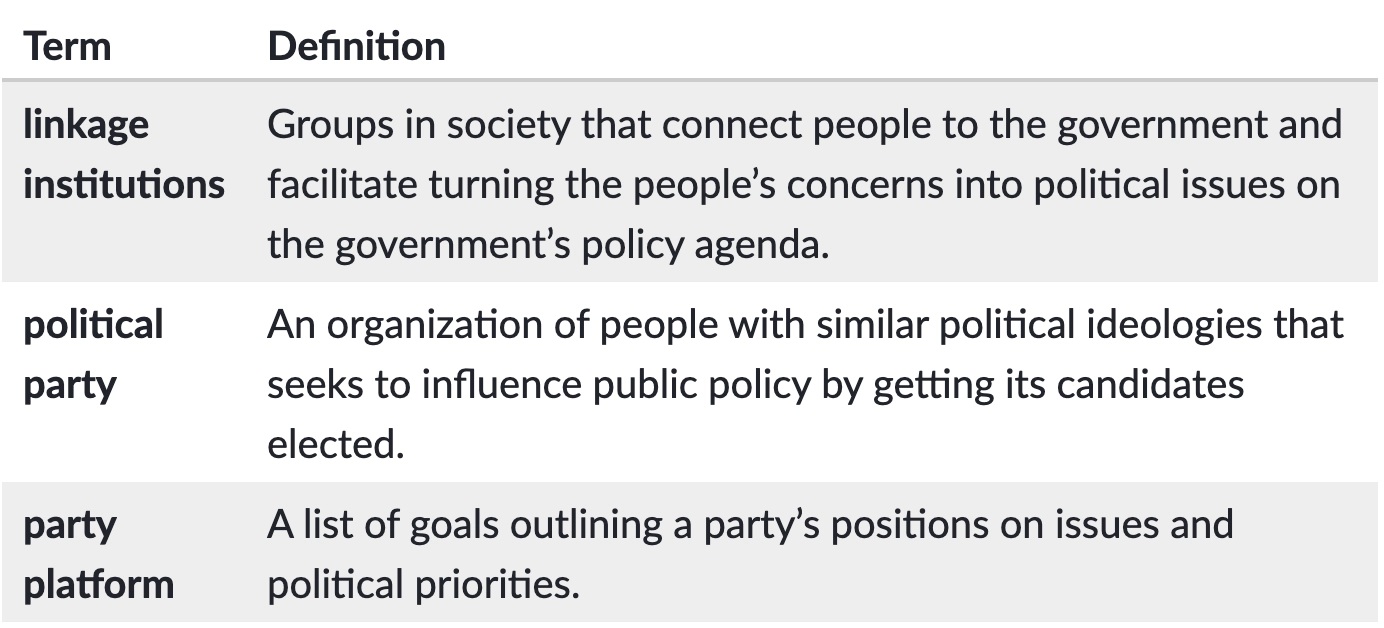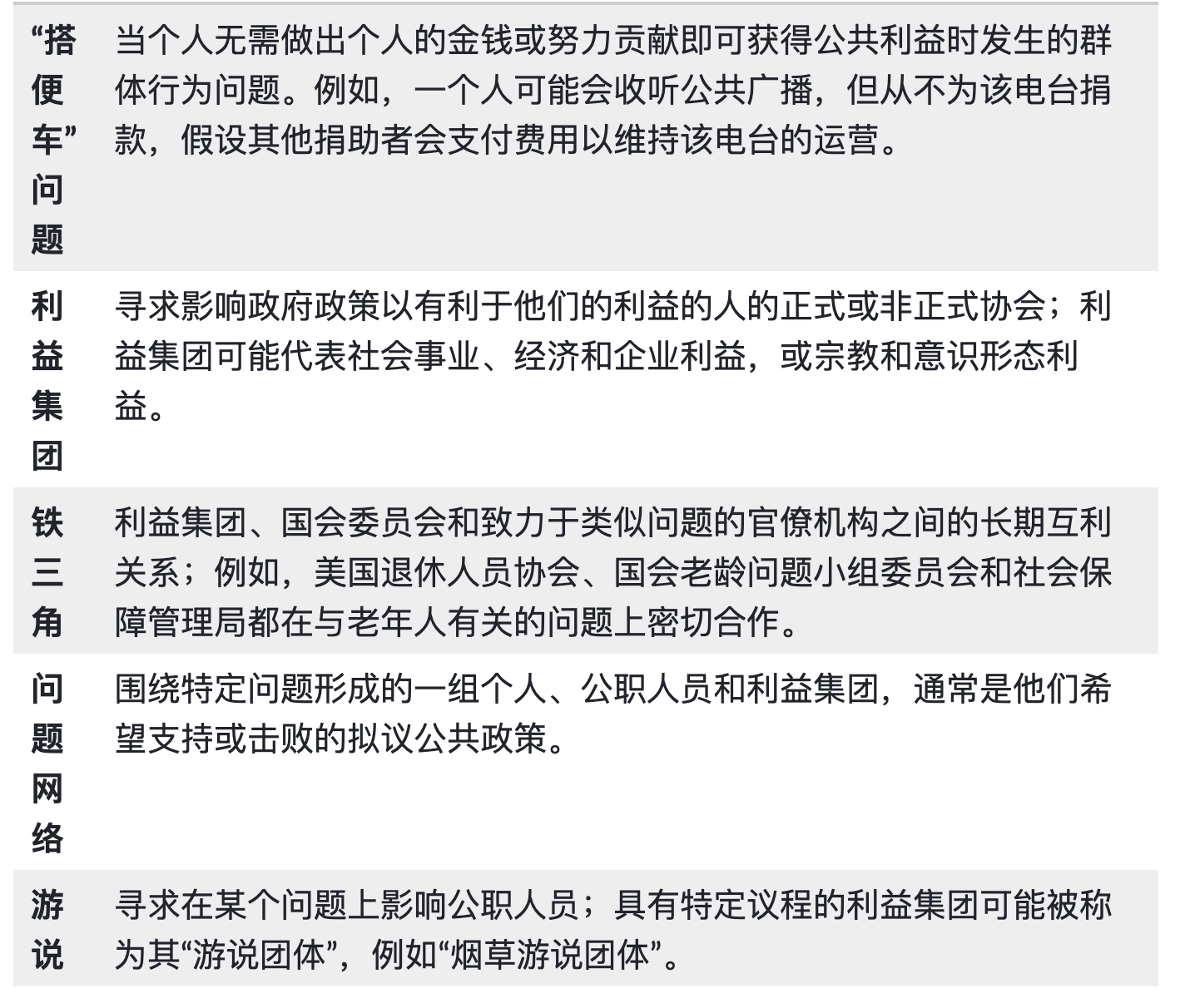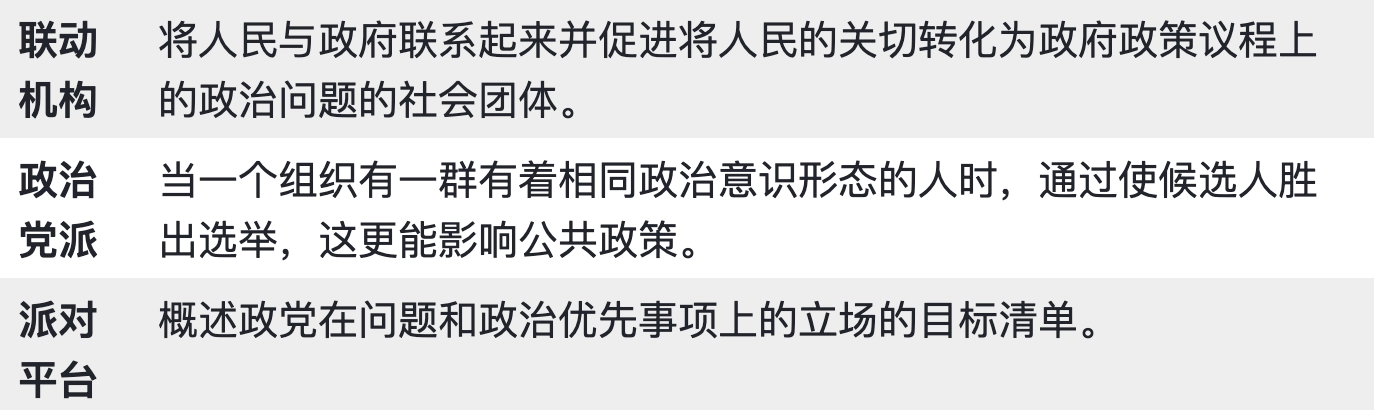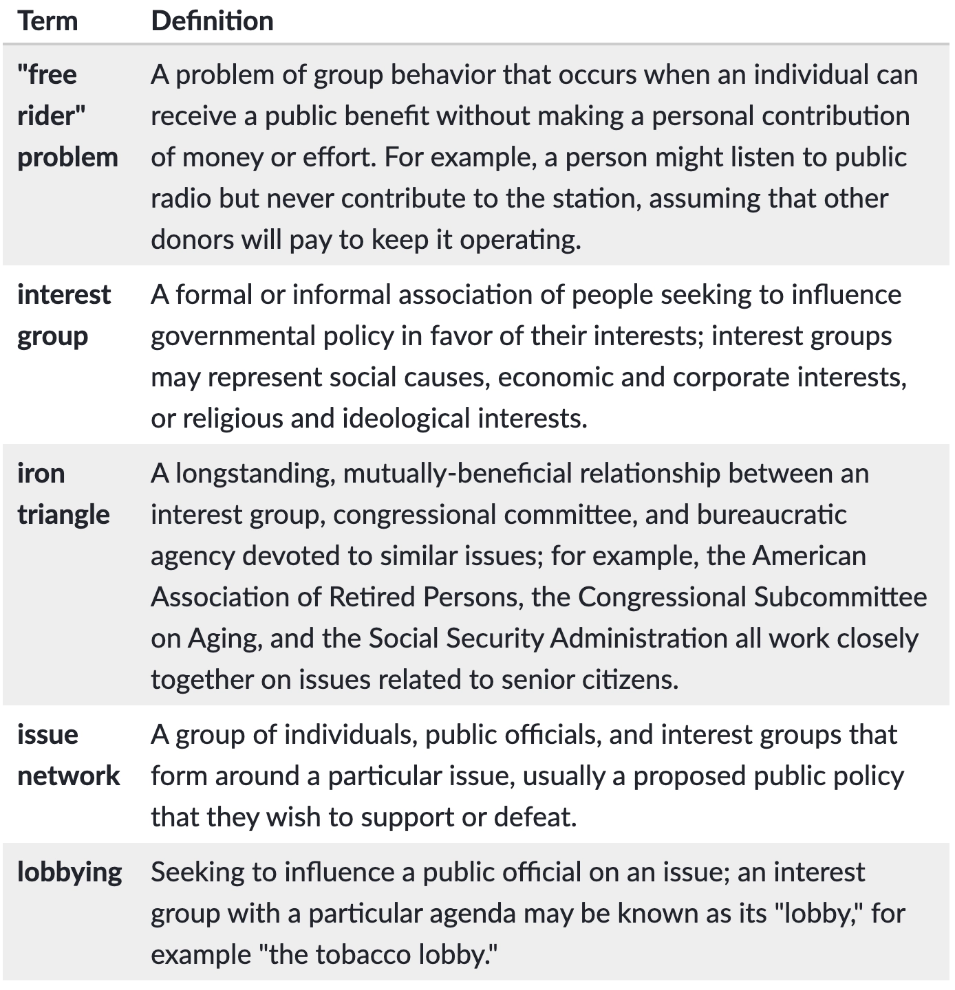 - 全国步枪协会(NRA)和国家妇女组织(NOW)这样的团体在许多方面影响决策者。他们通过金钱捐赠(Monetary Donations)、游说(Lobbying)和在国会听证会(Congressional Hearings)上作证来影响政治家。