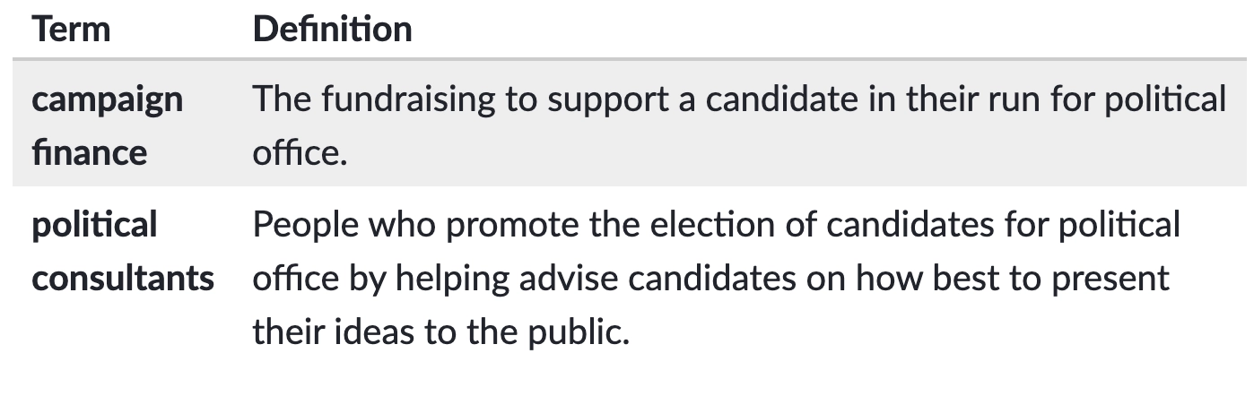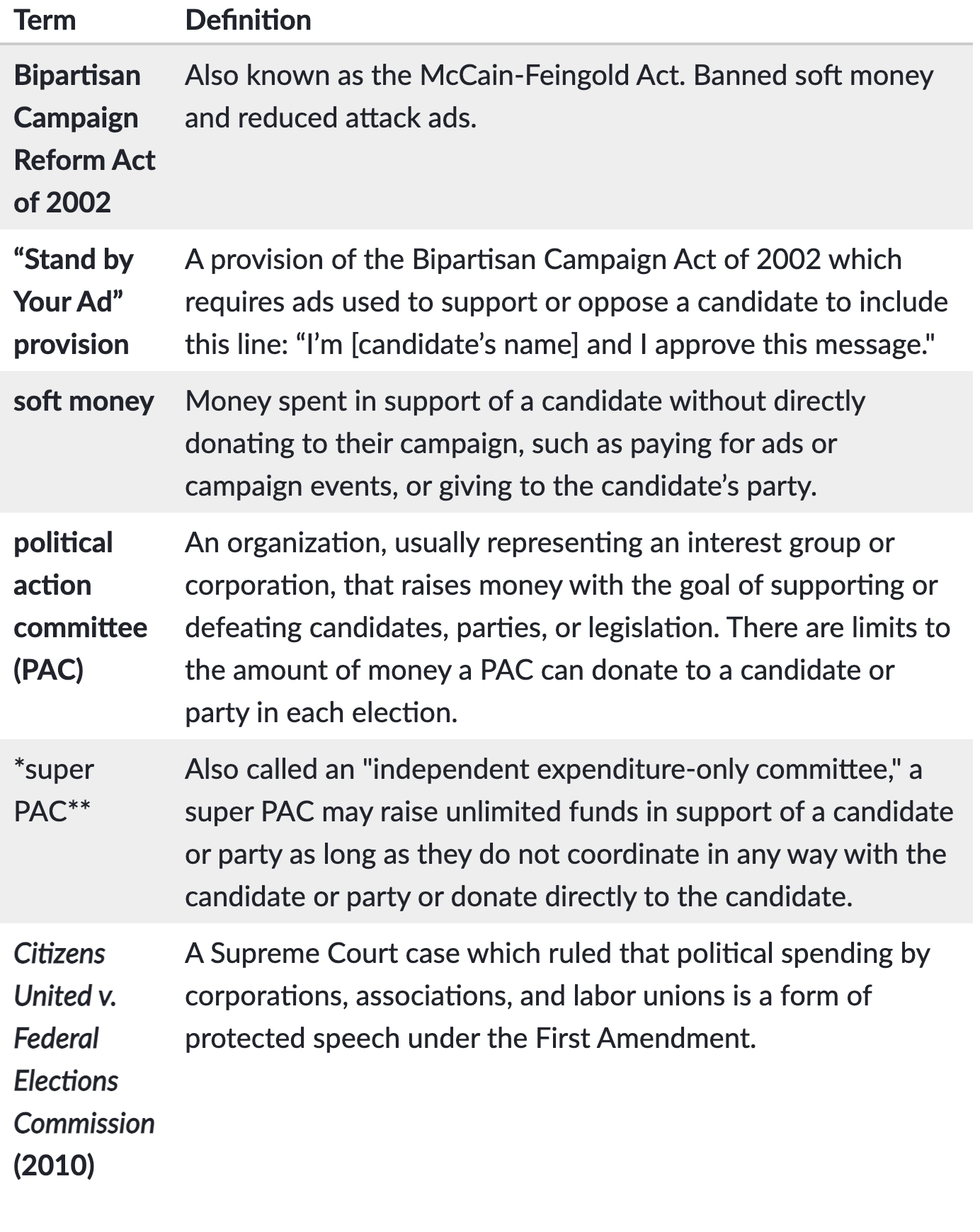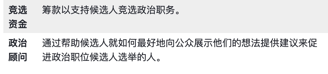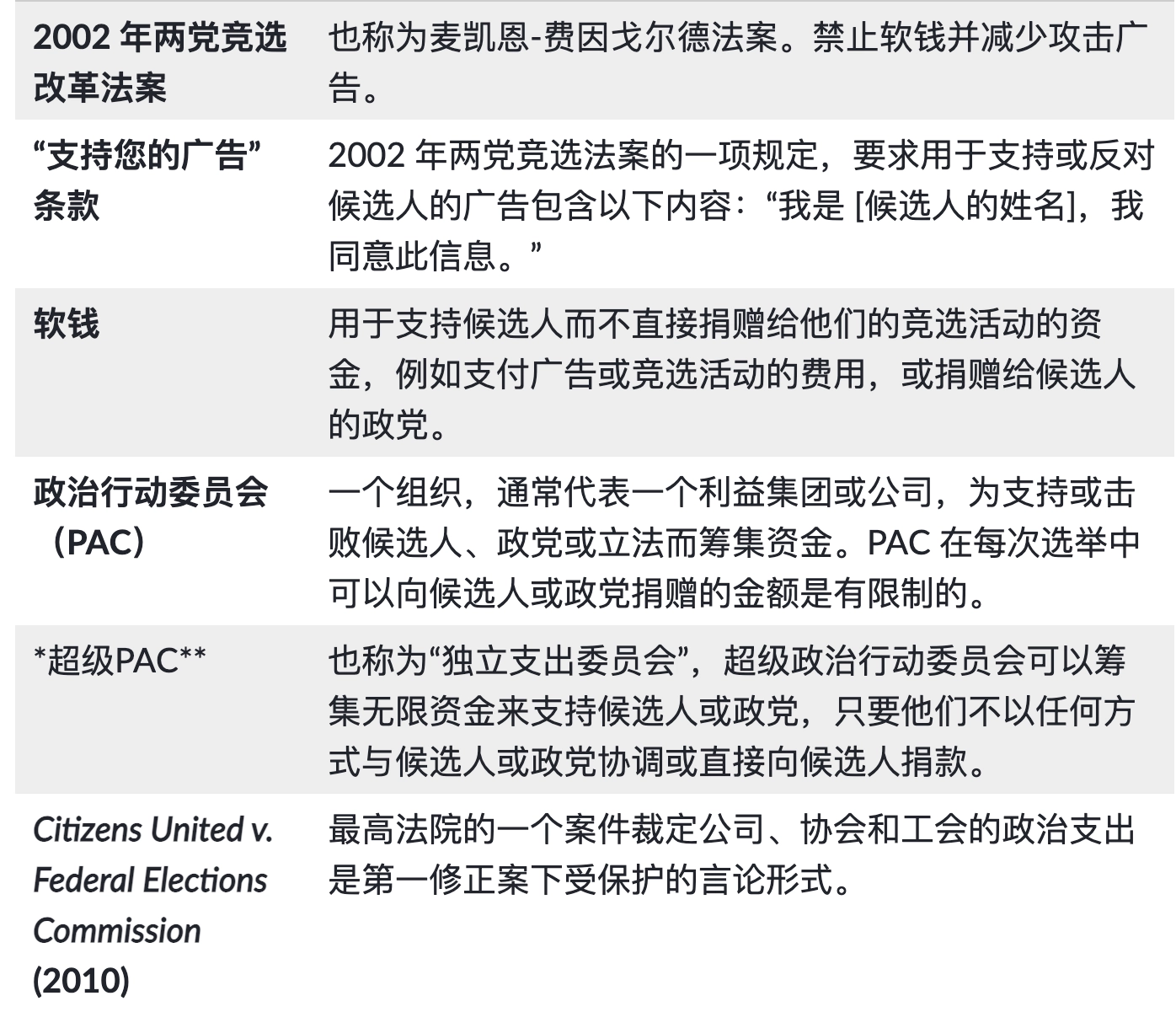 - 根据2002年颁布的两党选举改革法案441b条款,企业或团体在初选前30天或大选前60天资助跟竞选有关的、或抵毁候选人的言论是不被允许的