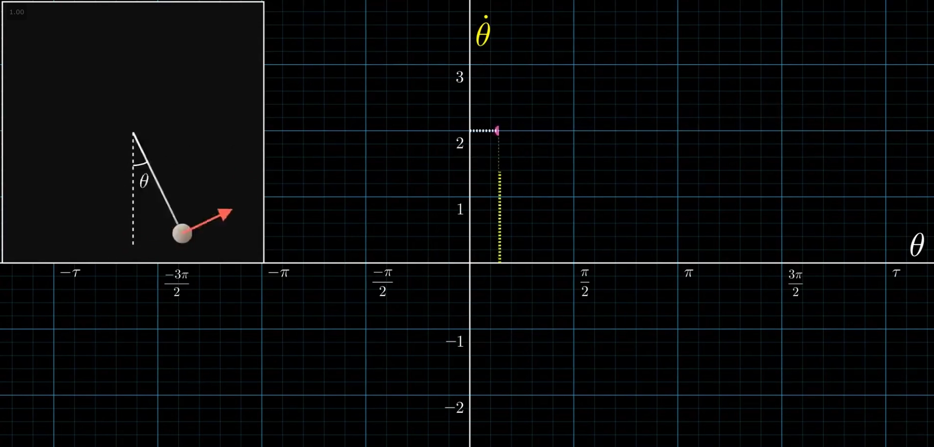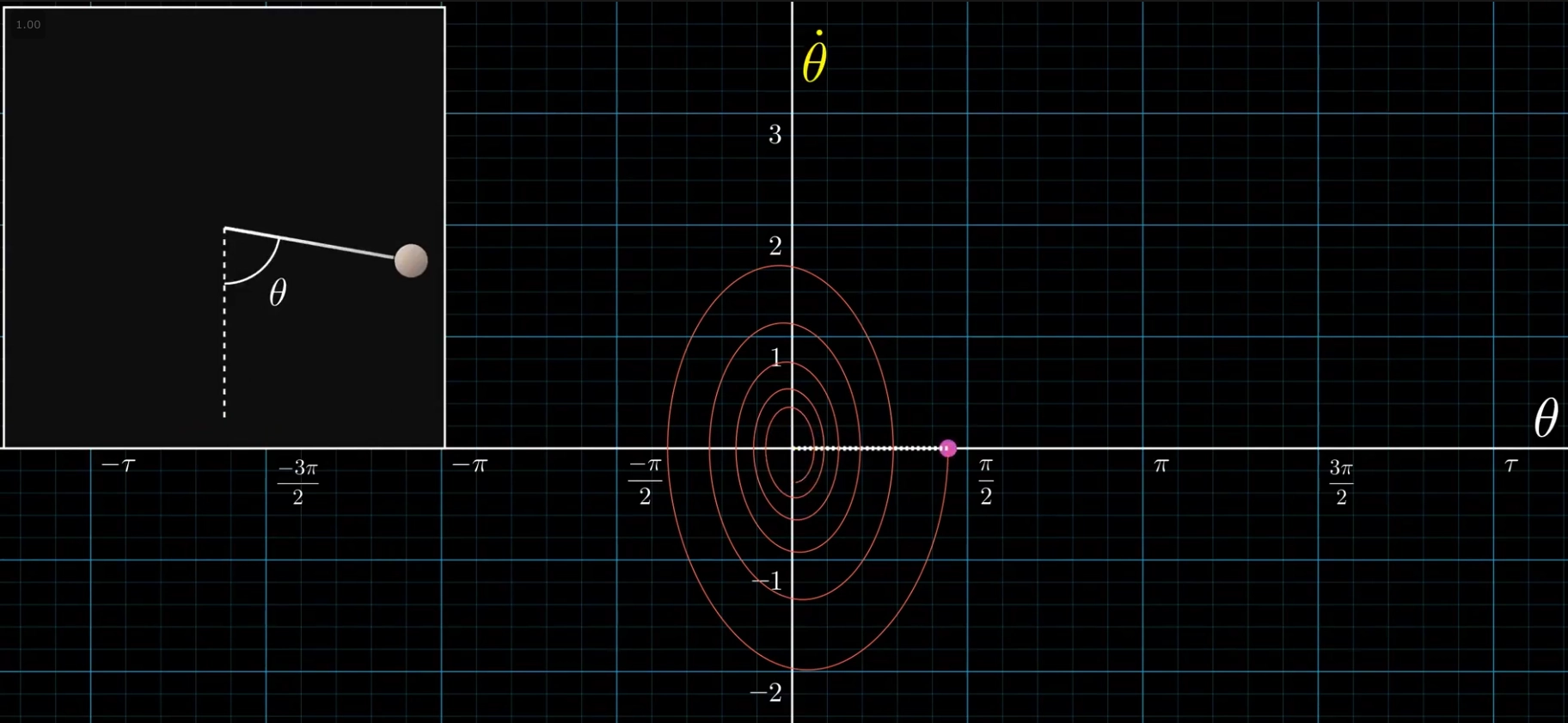 但我们可以尝试把上面的式子,构建 \(\dot{\theta} - \theta\) (影响加速度的两个因子)的图像。这个二维平面上的点,完全描述了任意时刻单摆的状态。