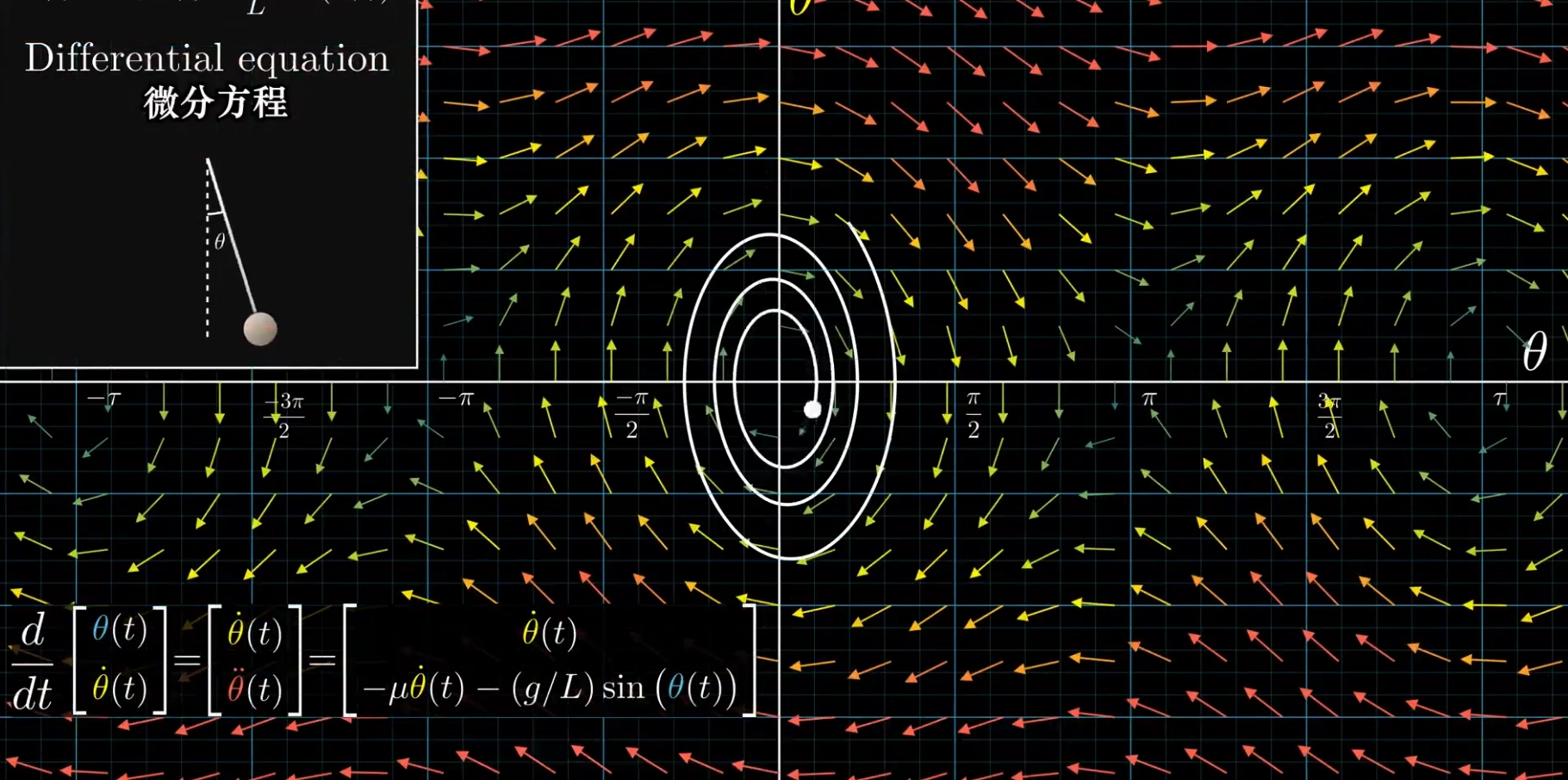 - 研究单摆的微分方程时,为什么我们先求加速度与角度的关系。因为直接求低维的角度与周期的关系过于的复杂,没法分析下手。越高维,抽象的角度来观测模型,事情便会变得简单。
