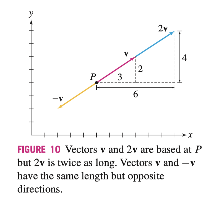 向量与标量(Scalar)的乘法(Scalar Multiple)\(c \mathbf{v} = \left< cv_1, cv_2, \cdots ,cv_n \right>\),且 \(\| c \mathbf{v} \| = |c| \| \mathbf{v} \|\)