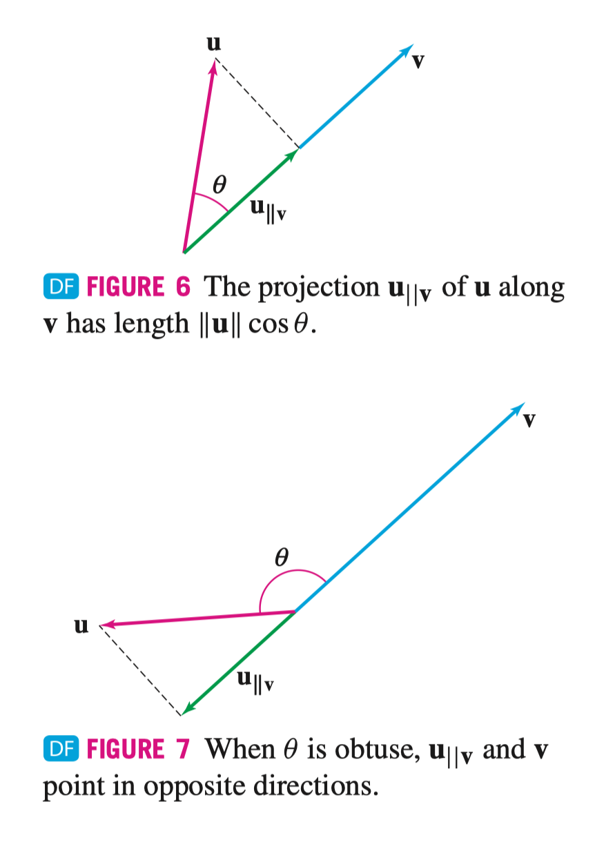 \[ \begin{aligned} \mathbf{u}_{\parallel \mathbf{v}} = \|\mathbf{u}\| \cos(\theta) \hat{\mathbf{e}_{\mathbf{v}}} &= \|\mathbf{u}\| \left(\frac{\mathbf{u} \cdot \mathbf{v}}{\|\mathbf{u}\| \|\mathbf{v}\|}\right) \cdot \frac{\mathbf{v}}{\|\mathbf{v}\|} \\[0.8em] &= \left(\frac{\mathbf{u} \cdot \mathbf{v}}{\|\mathbf{v}\|^{2}}\right) \mathbf{v} \\[0.8em] &= \left(\frac{\mathbf{u} \cdot \mathbf{v}}{\mathbf{v} \cdot \mathbf{v}}\right) \mathbf{v} \\[0.8em] &= \left(\frac{\mathbf{u} \cdot \mathbf{v}}{\|\mathbf{v}\|}\right) \hat{\mathbf{e}_{\mathbf{v}}} \end{aligned} \]